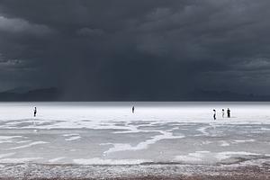 Visitors walk on Utah's Bonneville Salt Flats as a storm looms over the Silver Island Mountains in the background. All prints arrive unsigned.