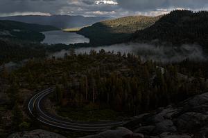 The view from Donner Summit in California looking down through Donner Pass with Donner Lake in the background as fog lifts following a rainstorm. All prints arrive unsigned.